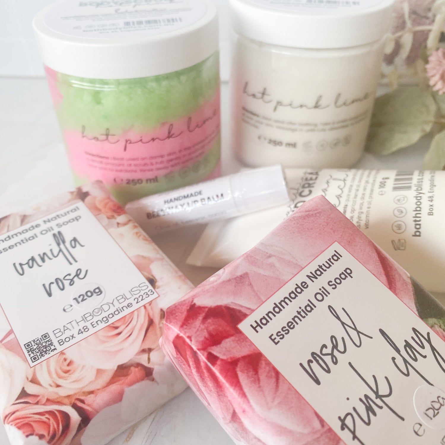 A selection of our pampering body scrubs and soaps, indulgent hand cream, & a luscious lip balm to keep her smile radiant.