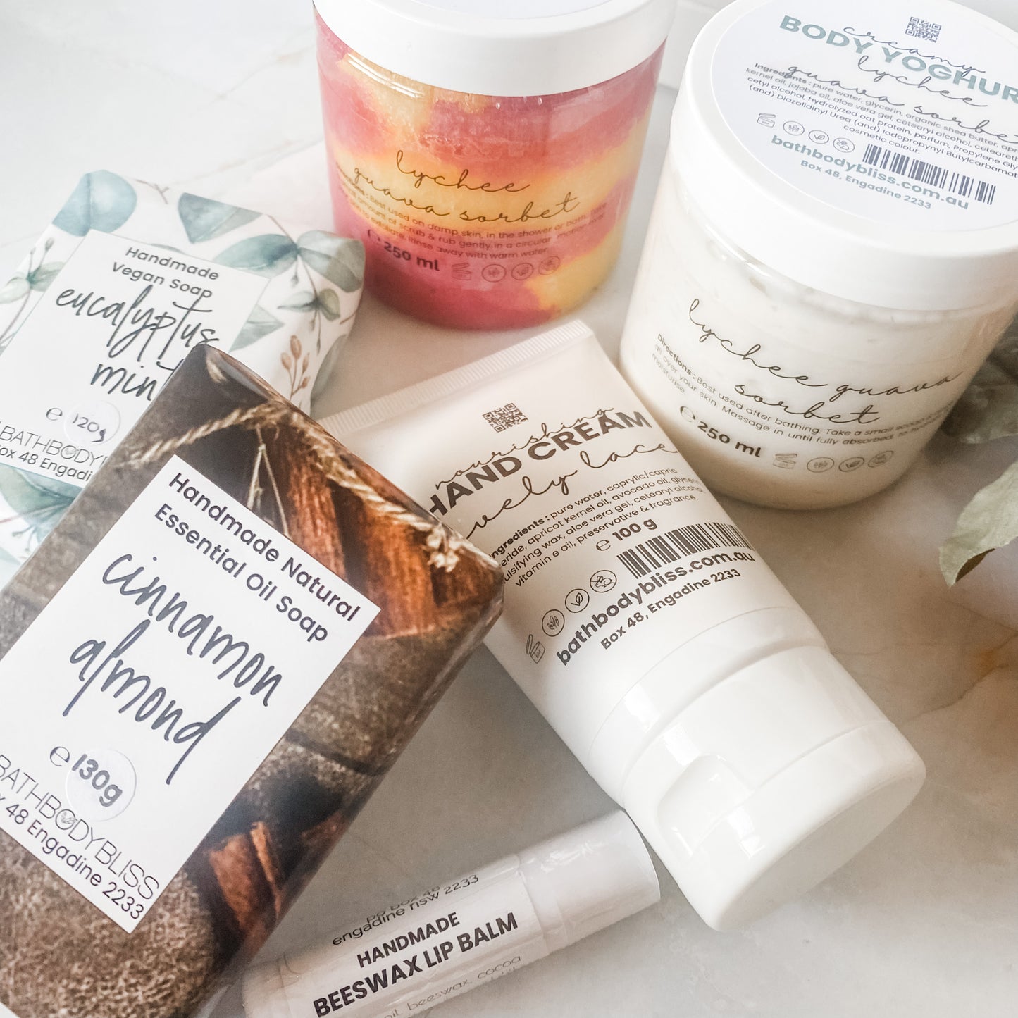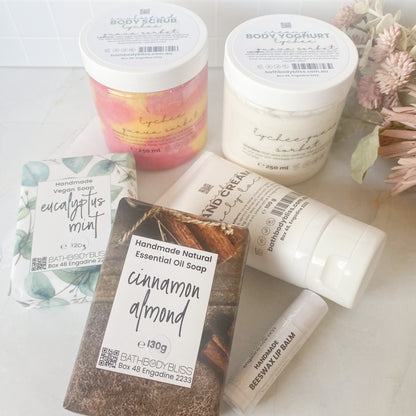 Select from our large range of fragrances for your body butter, body scrub & hand cream (1 scent for all 3 products), and our natural flavours for your lip balm.